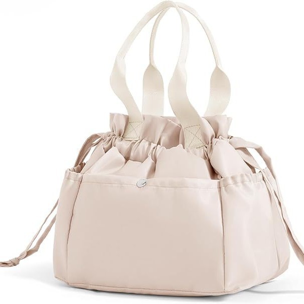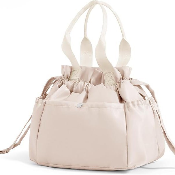 上品なリボンのような持ち手が特徴的な巾着デザインのポーチです。 開口部は紐で絞るタイプで中身をしっかり守りながら、必要な時にはさっと取り出せる便利な仕様になっています。 マチがたっぷりあるので化粧品や小物をたくさん収納でき、バッグインバッグとしても活躍します。 柔らかな素材感と丸みを帯びたフォルムが可愛らしく、普段使いから特別な日まで幅広くお使いいただけます。