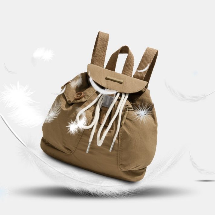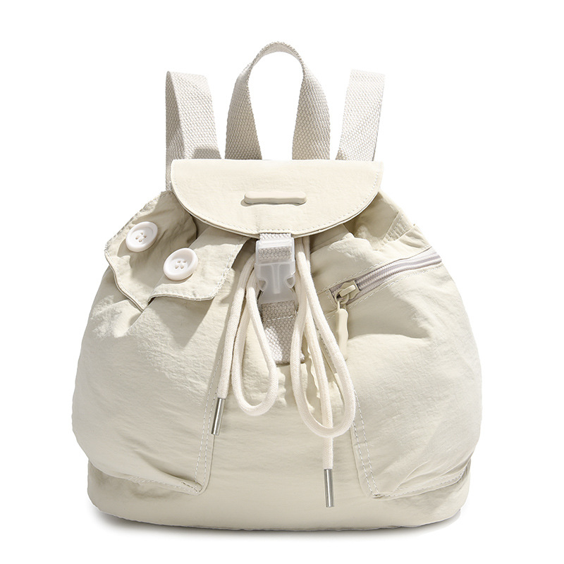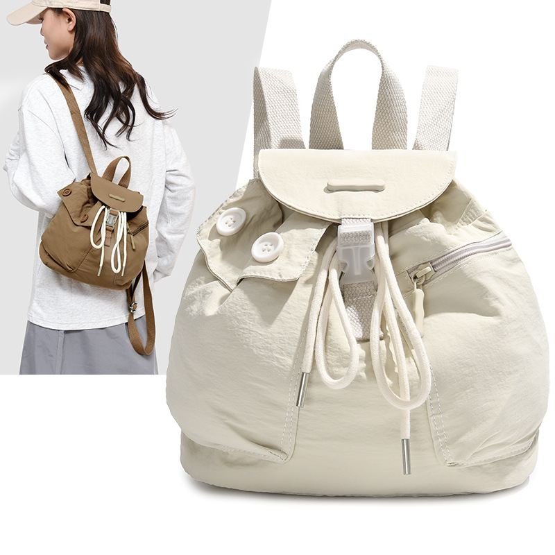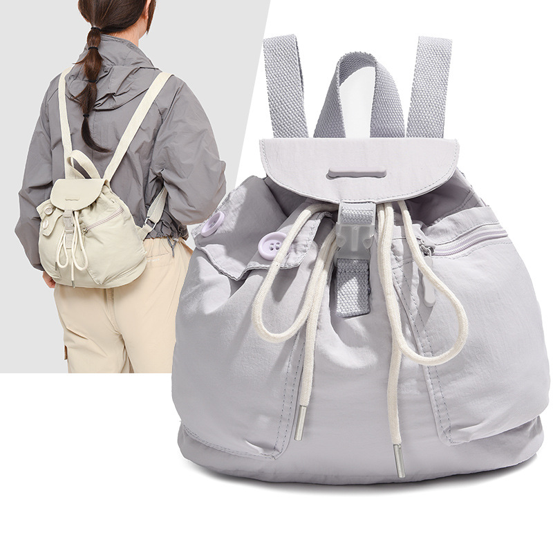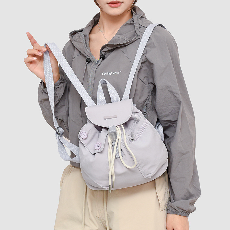 丸みを帯びた可愛らしいシルエットが特徴の巾着タイプのリュックです。 開閉は紐で絞るだけの簡単仕様で、使い勝手抜群です。 フロントには大きめのポケットが二つ配置され、小物の整理に便利です。 軽量なナイロン素材を使用し、長時間の使用でも肩への負担が少なく快適です。 調節可能なショルダーストラップで、自分好みのフィット感に調整できます。 カジュアルな日常使いから旅行まで幅広く活躍する実用的なアイテムです。